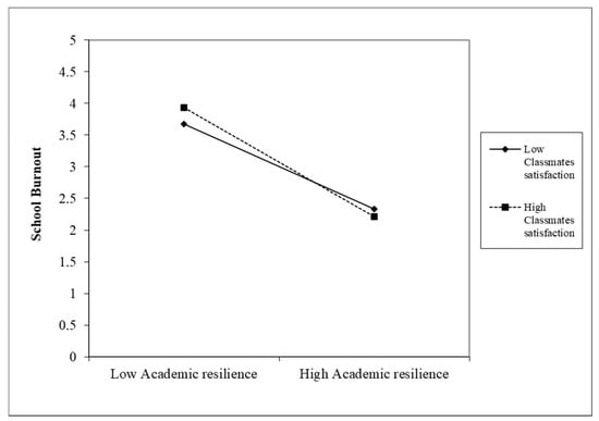 Moderation of satisfaction on the relationship with classmates on the link between academic resilience and school burnout.