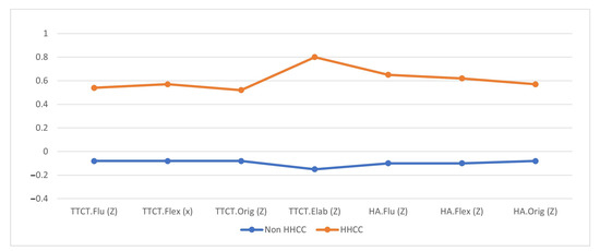 Scores in the different dimensions of creativity for both high-ability and non-high-ability students (standardized mean scores (Z) for creativity variables: non-HHCC, n = 177/178; HHCC, n = 31.