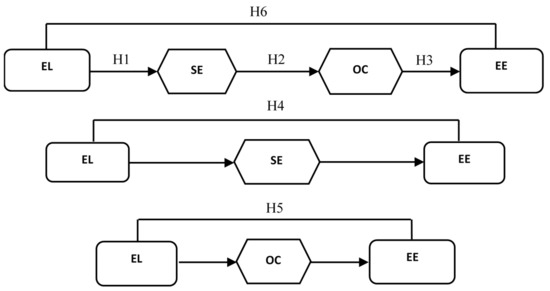 Sequential Mediation Model. EL: ethical leadership; SE: self-efficacy; OC: organizational commitment; EE: employee engagement.