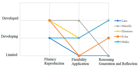 We also elaborate on the horizontal perspective of the framework by presenting selected students’ profiles—namely, the profiles of Lina, Manolis, Eleonora, Evita, and Makis (Figure 5). The selection aimed to (1) illustrate all of the different characterizations (presented in Table 4) by relying on students’ responses (i.e., developing and developed fluency; limited, developing, and developed flexibility; and limited, developing, and developed reasoning), and (2) reveal different profiles of students according to how they responded across the tasks. For example, Lina showed developing fluency, and limited flexibility and reasoning, while Makis also showed developing fluency, but developing flexibility and developed reasoning. In this way, it is then possible to compare different students’ profiles, and to use the profiles as cases for discussing instructional adjustments.