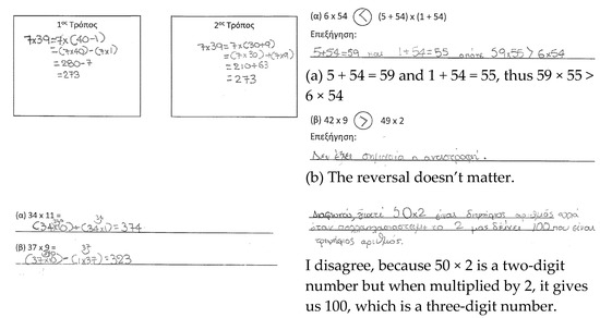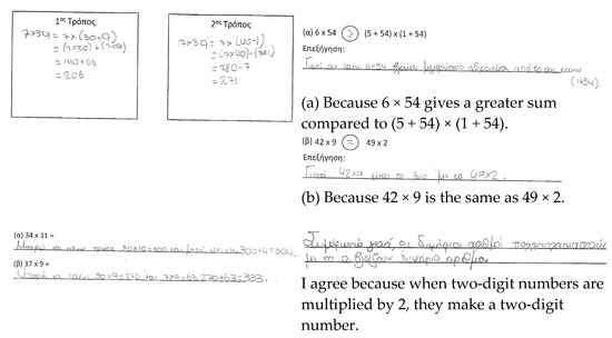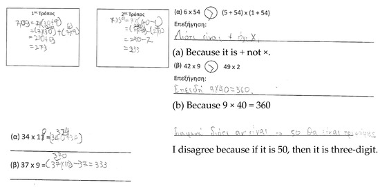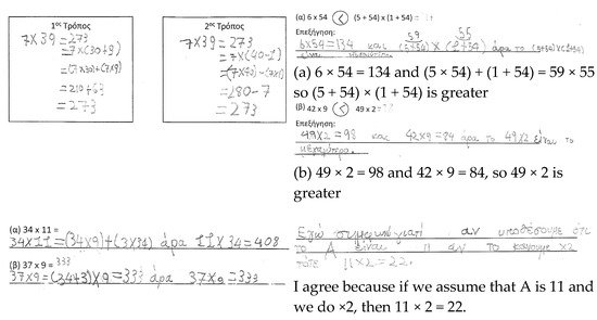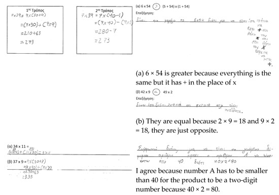 Manolis. Manolis showed a systematic method of work in the RT (Figure 7). In the AT1, he compared the multiplicands in the first set of expressions, while he tried to find the product in the latter set to compare the expressions. He relied more on the taught procedure than on the magnitude of the numbers (i.e., 4 tens times 9 compared to 4 tens times 2), and made computational mistakes. In the AT2, he adjusted the taught procedure to the context of the task by analyzing the multiplicands based on the given information. In the GRT, Manolis agreed with the given statement, and gave an example to justify his answer. He did not explore the whole spectrum of two-digit numbers to refute the statement. Manolis showed developed fluency and flexibility, while his mathematical reasoning was limited.