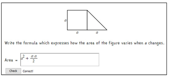 The path originates from some activities on algebraic computations and manipulation of algebraic formulas, seen in a geometry context. Symbolic computation is a core topic in the Mathematics curriculum of grade 8. Algebra constitutes one of the bases for operating with functions, which will be one of the main objectives of upper secondary Mathematics. Writing a formula to calculate the area, the perimeter, or the volume of a figure whose measures are expressed through letters and numbers is a pretext to analyze—from a geometrical, numerical, graphic, and algebraic perspective—linear, quadratic, and cubic functions. Algebraic thinking in geometry is proposed by several scholars to favor the understanding of variables as quantities to be related, rather than the symbols to manipulate [19,20,21,22]. We developed a set of tasks on symbolic computation taking inspiration from an item of the INVALSI tests for grade 8 of 2009, shown in Figure 1. It asks students to compute the area of a geometrical shape, a right trapezoid, whose measures are given in function of a variable. In order to correctly answer to the task, as a first step students need to find a way to compute the area of the trapezoid. They can recall the formula or decompose it in simpler shapes, with the given figure’s help. As a second step, they need to use algebraic rules to add and multiply algebraic expressions. Synthetizing the obtained formula in a compact form is not requested, with the answer being open. To solve the item, students have to combine geometrical and algebraic reasoning. The relation between geometry and algebra is what makes this task interesting. Measures of geometrical shapes are used to visualize algebraic operations, and it helps confer concreteness to abstract computations. The question was difficult, with 27% of students achieving correct answers. This indicates the students’ low level of flexibility in connecting different areas of mathematical knowledge; nevertheless, the processes that this item involves are very interesting from a didactic point of view.
