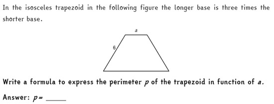 We checked if the reasoning promoted through these activities was assimilated and deeply understood by the students through the final test, which students undertook about two months after working on the “Formulas and Functions” activity. The final test included an item of algebraic manipulation in a geometrical context, where students were asked to compute the perimeter of a trapezoid whose sizes were given through variables and constants. The text of the item is shown in Figure 6. This item is similar to an item proposed in the 2018 INVALSI test to all the Italian students of grade 8 (the same item analyzed in [15]). We computed the rate of correct answers to this item and compared them with the rate of correct answers registered by the national sample of the INVALSI test. We found that the students participating in this experimentation registered a high percentage of correct answers (67%). This percentage is clearly higher than the national sample’s one, which only achieved the 34% of correct answers, when they faced a similar question.