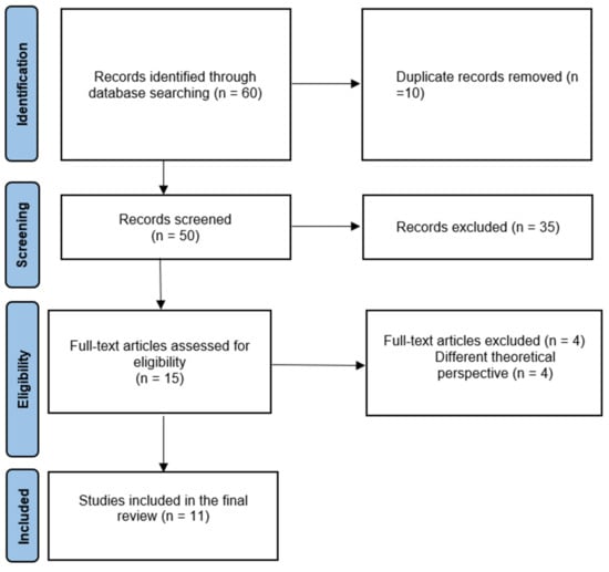 Once the field of investigation was defined, the electronic records were identified utilizing a bibliographic search conducted by inserting the algorithm of keywords and Boolean operators such as “AND”, “OR”, and “NOT” in the scientific databases taken into consideration (SCOPUS, EBSCO, and PsycINFO), which were chosen for their reliability and relevance to the social sciences. The study was conducted according to the principles of systematic reviews following the guidelines of PRISMA (Preferred Reporting Items for Systematic Review and Meta-Analysis for qualitative synthesis) [].