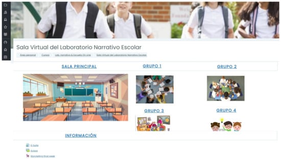 Digital storytelling is a powerful educational tool that enhances the possibilities in creating shared stories and their subsequent transmission [28,30,43,44]. It results from the combination of collaborative storytelling and multimedia technology [45,46,47] Online learning-management systems such as Moodle (https://moodle.org (accessed on 20 November 2021)) can support digital storytelling through the creation of creative and collaborative communities where students are the protagonists and where there is sharing of knowledge and narratives through collaboration [48,49,50,51]. Barriers to online learning are perceived to decrease as age and experience increase [52,53]. In online cooperative digital storytelling, the class can be involved in real-time interactions, showing horizontal and networking characteristics, where students are also responsible for their peers’ creative collaboration skills [48,54,55]. Online creative collaboration involves socio-cognitive skills such as communication, interaction, reflection, exploration of possible options, reliability, and mutual co-operation. In addition, real-time interaction is one of the advantages of an online-learning system like Moodle that can be modularized with different digital extensions for free discussion and meetings, collecting opinions, sharing, and writing documents, ideas, and evaluations.