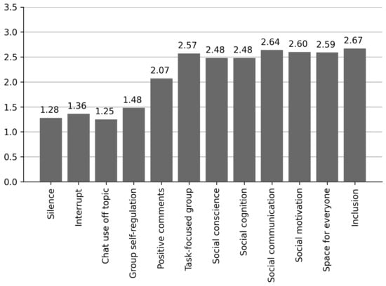 The results supported hypothesis 1 that primary school students would work collaboratively within an online space for group storytelling (Table 3, Figure 2). According to the facilitators’ observations, platform use and collaboration scores reached acceptable values in all sessions (Figure 2). Behaviors related to improper platform use (silence, interruption, off-topic chat use, and group self-regulation) were low. On the other hand, behaviors that indicate good platform use and collaboration reached medium-high values (positive comments, task-focused group, social awareness, social cognition, social communication, social motivation, space for everyone, and inclusion).