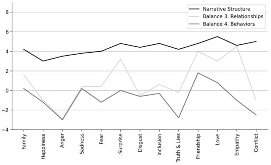 Regarding the evolution of storytelling content, there is a typical tendency, especially after six to seven years, in children without emotional and behavioral difficulties, to balance negative and maladaptive contents with positive and adaptive ones [1,2]. As in the decision-making process, the general plans necessary to create a story are used to control the declared information, allowing the construction of new global meanings and progressively closing the elements opened throughout the story [24,25,26].