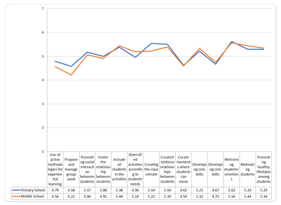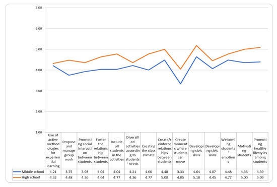 Figure 2). In particular, they felt less able to propose group work, promote physical exercise and strengthen the students’ life skills. In carrying out their professional practices at a distance, secondary school teachers expressed a perception of medium-low self-efficacy. In this case too, the activity in which they felt they had the most difficulty was the promotion of motor activity; those in which they felt most capable were creating and strengthening the bond between teachers and students, developing citizenship skills, motivating students and encouraging healthy lifestyles.