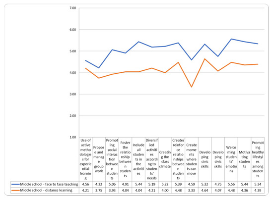 The high school teachers, compared to the middle school teachers, felt more able to face the challenges of their professional practice, in relation to health promotion, with a distance learning mode instead of face-to-face (see