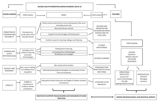 Among school leaders, the creation of a network and exchange of information and best practices emerged as essential needs. These needs originated not only from the desire to continue the debate, but also from the value and uniqueness of the space the school leaders were offered: for the first time they found a space and a time to interact with each other among peers, where bureaucratic duties gave way to sharing of thoughts about the management of the schools, in the crucial period that started in March 2020, without forgetting the issues of health promotion. This time of discussion, in the form of a focus group, was highly valued by all participants.; the goal was to create an opportunity for reflection on practices, exchange and sharing of point of views, appreciation of what has been carried out so far and innovation and production of new ideas.