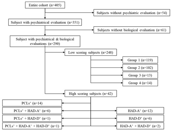 The studied cohort (Figure 1, n = 290) was extracted from the initial population (n = 405). Soldiers who did not fully complete the PCL, HADS-A and HADS-D questionnaires (n = 54) were excluded, as were those who did not provide full biological data (n = 61).
