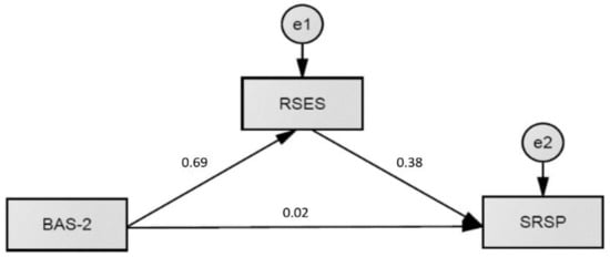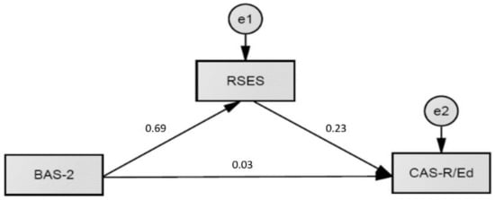 Self-esteem fully mediated the relationship between BAS-2 and perceived academic achievement (standardized path c′ = 0.02; p = 0.95), with a significant indirect path BAS-2 → RSES → SRSP (standardized path axb = 0.27; p < 0.001). A similar mediation effect of self-esteem was shown in the association between PBI and educational aspirations. Self-esteem fully mediated this relationship (standardized path c′ = 0.03; p = 0.95) with a significant indirect path BAS-2 → RSES → CAS-R/Ed (standardized path axb = 0.16; p < 0.001).