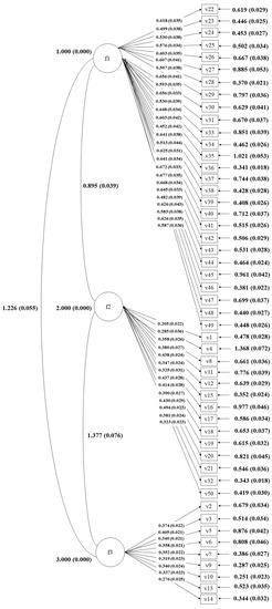 After performing the EFA and obtaining the data on reliability for each item, we obtained the instrument’s validity through CFA. To achieve this, we grouped the 50 questions into a three-dimensional structure: F1 = privacy, data protection, and digital security; F2 = relationship with people, digital content, and entities; and F3 = harmful behavior. The model results showed absolute confirmation of the model. On the other hand, by confirming the indices that infer model fit, we obtained a good fit. From examining the values of the different indices, the CFI contributed a value of 0.786, while the TLI was 0.776. The Chi-square took a value of 11,552.977 with 1225 degrees of freedom. The SRMR took a value of 0.068. Finally, the RMSEA value indicated an acceptable model fit, with a value of 0.060. Since these parameters served as a fundamental pillar in the analysis, Figure 1 confirmed that the proposed model showed a reasonable and acceptable approximation of the data, thus contributing to the solidity and verification of the three-dimensional hypotheses of the construct tackled. To conclude, we reviewed the analysis of the proposed factor model. Figure 1 presents the estimations of the factor saturations obtained for each item.