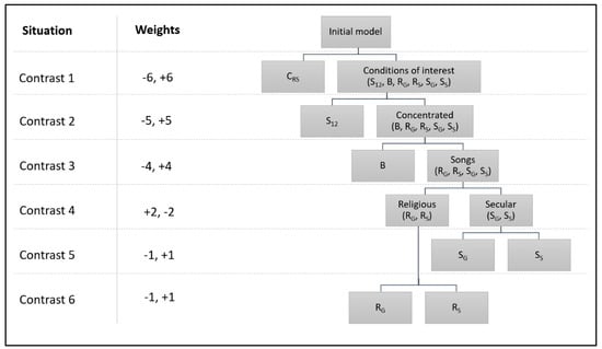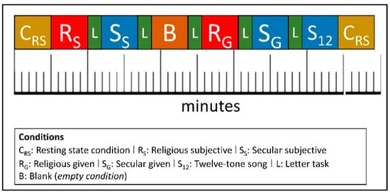 The participants were advised to try to worship and to induce the experience during each of the conditions, except during the letter tasks and the resting states. Each condition took about 4.5 min [44]. The songs that were longer were cut at natural breaks so that they amounted to 4.5 min, and if they were shorter, they were sound engineered with Audacity 2.4.2. to naturally end at 4.5 min (by, for example, inserting a chorus or a verse twice).