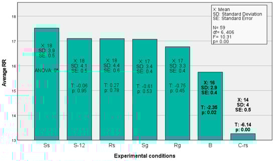 Average RR displayed by experimental condition. (* The ANOVA in SS was zero due to its calculated redundancy for the constant term in the model).