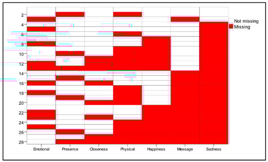 Depiction of missing values with the colored boxes (participants were asked to tick the type of religious experiences they usually experience during worship).