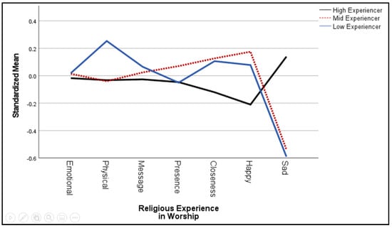 The low experiencers (LEs) had a difficult time focusing on God and were the least likely to have an intense religious experience during the worship practice. Despite their difficulty to let go and to sink into a deep experience, they appeared to be more traditional since their worship frequency lay between those of the mid and high experiencers. Their experience of the divine presence was much more frequent and constant than with the HEs but a lot less intense. However, their experience was not as constant and intense as with the MEs. They were highly extroverted and open to the world but not as emotional and conscientious—hence, they appeared to be adventurous pragmatics.