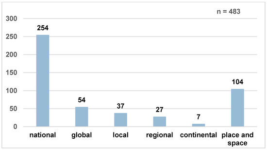 In addition to the classical scale levels, students also located culture in places and spaces, as a total of 104 spatial references did not contain any of the classical scales. Instead, further spatial concepts were used to evaluate and describe the remaining 104 statements (see Figure 4). The English geographical concepts of space and place understand space as relative, i.e., in dependence on the meaning for persons or groups and their relational structure [55]. In addition to the material aspects of place and space, the symbolic and emotional meanings also play an important role and contribute to their existence [56]. While place defines a particular place through its physical location or its specific socio-cultural meaning and materiality for individuals or collectives [57], spaces are understood as space-generating, dynamic networks that exist between people, objects, locations, and their relationships [56]. The majority of the students’ statements could be attributed to these different meanings of places.