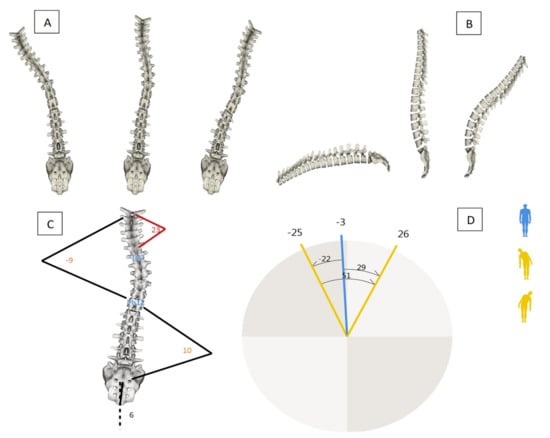 - Mannion, A.F.; Knecht, K.; Balaban, G.; Dvorak, J.; Grob, D. A new skin-surface device for measuring the curvature and global and segmental ranges of motion of the spine: Reliability of measurements and comparison with data reviewed from the literature. Eur. Spine J. 2004, 13, 122–136. [Google Scholar] [CrossRef]