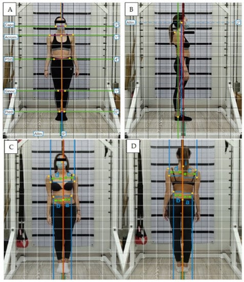 Four different photogrammetry analysis: (A) postural analysis on frontal plane, (B) postural analysis on sagittal plane, (C) ATSI evaluation, and (D) POTSI evaluation.