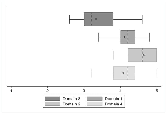 Figure 4 shows boxplots of SRS domain three and the other domains mean (one, two and four), in which is displayed the relative mean difference (point distance among two diamonds). Its value equals to −0.97 (95% C.I.: −1.24; −0.70), the value of statistic t is −7.79, and p is <0.001.