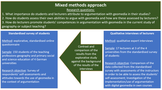 Methodologically, we proceeded in three steps: first, to survey the importance that students and teachers in geography attach to the use of argumentation with digital geomedia; second, to investigate how students themselves assess their competences in relation to the use of argumentation with digital geomedia and how teachers assess these competences; and third, with regard to teachers, to survey how they promote their students’ competences in these areas. For this purpose, a mixed-methods approach was developed in which a quantitative and a qualitative sub-study were conducted and directly related to each other in the form of a sequential multi-method design [42] (p. 27).