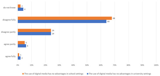 The overall very positive attitudes of the lecturers towards the field of argumentation with geomedia is also reflected in the survey among their students. 95% of the 150 respondents partly or fully agreed with the statement: “The use of argumentation in teaching and studying promotes critical thinking and the formation of opinions”. With regard to the statement “Argumentation contributes to a mature use of digital geomedia”, 82% agreed. Consequently, students to a large extent consider argumentation as a useful method to acquire a competent use of geomedia. The statements used as a control that the use of digital media has no advantages in studies or school lessons also show that the students are convinced of the great importance of digital media (Figure 3).