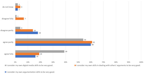 In contrast, the students assess themselves quite differently, both in terms of argumentation skills and in terms of their skills in dealing with digital media in general (cf. Figure 4).