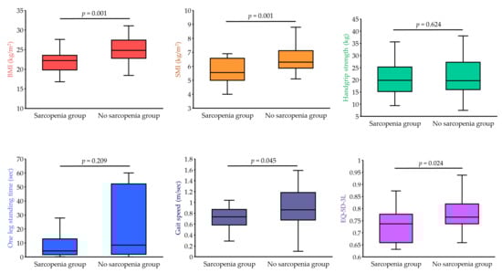 - Sun, S.; Lee, H.; Yim, H.W.; Won, H.S.; Ko, Y.H. The impact of sarcopenia on health-related quality of life in elderly people: Korean National Health and Nutrition Examination Survey. Korean J. Intern. Med. 2019, 34, 877–884. [Google Scholar] [CrossRef]