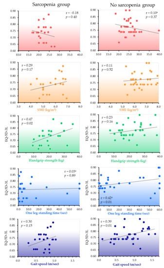5.2. Interrelationship with HRQOL in Those with and without Sarcopenia