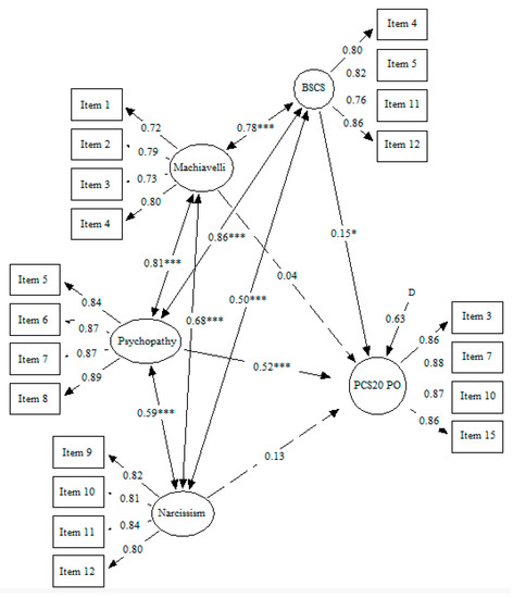 - Paulhus, D.; Buckels, E.; Trapnell, P.; Jones, D. Screening for Dark Personalities: The Short Dark Tetrad (SD4). Eur. J. Psychol. Assess. 2021, 37, 208–222. [Google Scholar] [CrossRef]