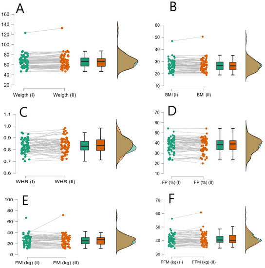 Raincloud plot for the individual data of the study participants. Panel (A), weight, Panel (B) BMI (Body Mass Index), Panel (C) (WHR) Waist Hip Ratio, Panel (D) (FP) Fat Mass Percentage, Panel (E) (FM) Fat Mass in Kilograms, Panel (F) (FFM) Fat Free Mass in Kilograms.