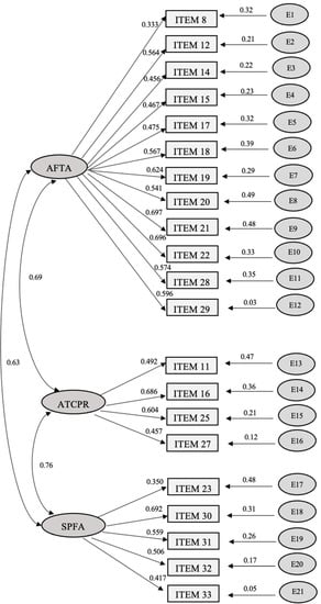 Finally, Pearson’s correlation coefficient was applied to determine the percentage of shared variance between the three factors [49,50]. Table 4 shows that the highest correlations are between Factors 1 and 2, which have a covariance of 0.422, this relationship being significant (with a p-value < 0.01) and considered “moderate”; as well as Factors 1 and 3, with a covariance of 0.244 (also a significant association with p-value < 0.01), considered a positive co-relation but “low”.