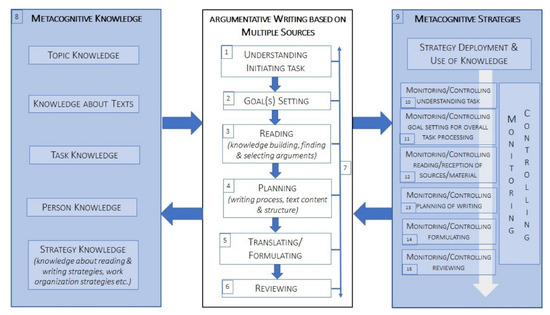 Metacognition is now considered to play an essential function in learning, particularly in cognitive (learning) processes involving reading and/or writing. More specifically, argumentative writing about complex and controversial topics based on multiple sources requires challenging skills, including strategic thinking, which involves making “metacognitive judgments regarding comprehension quality and adequacy of task performance” [6] (p. 1f.), [7,8]. In these complex tasks, the collation of material from different sources provides the basis for text production because the information from these different sources must be analyzed in relation to each other and used in independent argumentation [9].