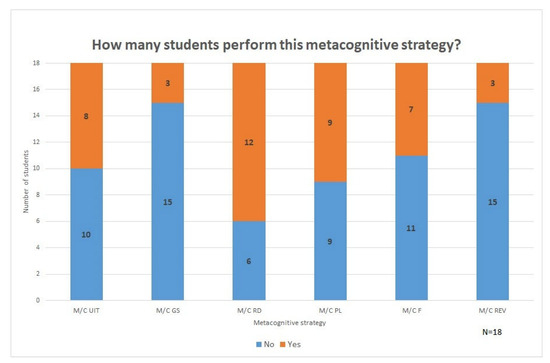 Proportion of students using each metacognitive strategy (own elaboration): M/C UIT = Monitoring/Controlling Understanding Initiating Task, M/C GS = Monitoring/Controlling Goal(s) Setting, M/C RD = Monitoring/Controlling Reading, M/C PL = Monitoring/Controlling Planning, M/C F = Monitoring/Controlling Formulating, M/C REV = Monitoring/Controlling Reviewing.