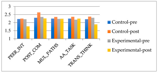 In relation to the results of the pre-test data, both the experimental group and the control group presented similar values in each of the STEAM dimensions. For the control group, the dimension with the highest score with a mean of 2.30 was Positive Communication (POST_COM), and the one with the lowest score with a mean of 2.21 was Transdisciplinary Thinking (TRANS_THINK). For the experimental group in the pre-test, the dimension with the highest value was also POST_COM but with a mean greater than 2.35, in reference to the control group. In contrast, the least valued dimension with a mean of 2.18 was Authentic Approach and Tasks (AA_TASK).