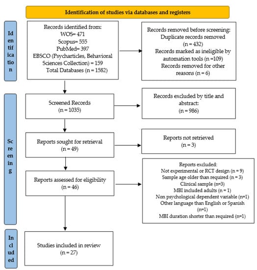 Preferred Reporting Items for Systematic Reviews and Meta-Analyses (PRISMA) guidelines were used to examine reporting in a systematic way. A total of 1582 records were retrieved in the literature search. After removing duplicates and eliminating non-peer-reviewed studies, a total of 1035 articles were left. They were screened by title and abstract, checking the study method and sample. Doubtful cases were checked and solved by 2 independent judges. A total of 161 studies were sought for retrieval and were checked by screening the full text. Finally, 46 studies were assessed for eligibility, based on inclusion and exclusion criteria. A total of 19 articles were excluded because they were not experimental studies (9 studies), the sample average age was older than required (3), the sample had a clinical diagnosis (3), and were published in a different language than required (1), the MBI included adults (1), included only non-psychological dependent variables (1), or the implemented intervention was shorter than required (1). A total of 27 articles were considered eligible for inclusion through this combined search strategy (Figure 1). The methodological quality of these reviews was examined using the Cochrane Guidelines. Studies included in this review meet minimum quality standards set by Cochrane Guidelines.