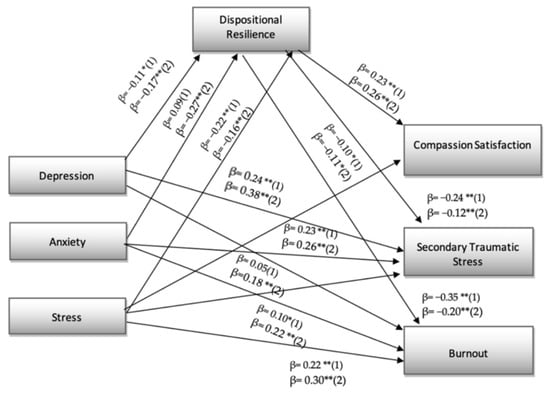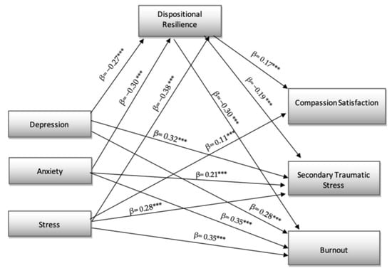 Moreover, anxiety had a positive direct effect on secondary traumatic stress (β = 0.21; p < 0.001) and burnout (β = 0.35; p < 0.001) and negative on dispositional resilience (β = −0.30; p < 0.001). Finally, stress had a positive direct effect on secondary traumatic stress (β = 0.28; p < 0.001) and burnout (β = 0.35; p < 0.001) and compassion satisfaction (β = 0.11; p < 0.001) and negative on dispositional resilience (β = −0.38; p < 0.001).