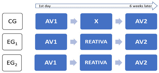 A quasi-experimental intervention-action study was conducted with three distinct groups: one control group (CG) without any prescriptive intervention who filled in the assessment questionnaires in the pre-test and post-test assessments; and two experimental groups (EG1 and EG2), who were both submitted to the REATIVA program and filled in the assessment questionnaires in the pre-test (Av1) and post-test (Av2) assessments (Figure 1).
