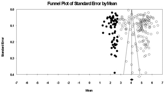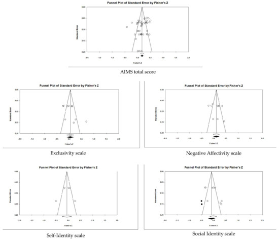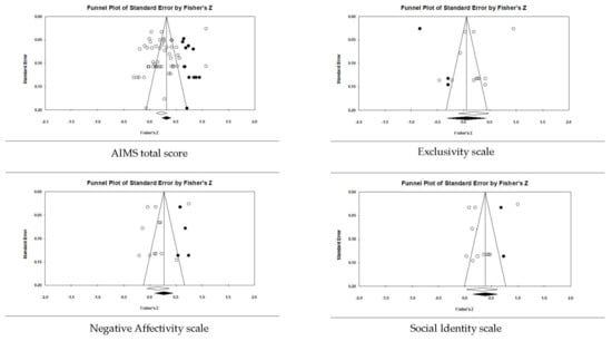 SL and SC coded the studies on the following individual study risks of bias: data sampling methods (i.e., convenience or a form of random sampling), data collection methods (i.e., in-person or not), and the reported AIMS study-level reliability values (i.e., yes or no). ML discussed all coding in pairs (SL/ML and SC/ML). We planned to examine whether either risk moderated our mean level and correlate results. For risk of bias across studies, we examined publication bias with the following: the classic fail-safe n, Orwin’s fail-safe n, the funnel plot, and the ‘trim and fill’ results. The classic fail-safe n statistic represents the number of null samples required to change a significant value into a non-significant value [15]. Orwin’s fail-safe n is not identical to the classic fail-safe n because Orwin’s fail-safe n is the number of potential missed studies that, when added to the actual data, would move the new correlation past a chosen threshold [16]. We chose r = 0.00 as our missed study value and r = 0.10 as our threshold, as this value is the lower end of a correlation with low meaningfulness. Hence, the greater the value for both fail-safe n calculations, the greater the confidence that the result is safe from publication bias. We specified the one-tail test when we conducted the classic fail-safe n analysis. To see whether the entered studies dispersed equally on either side of the overall effect, we examined funnel plots [17]. Full plot symmetry represents that the retrieved studies captured the essence of all studies. Last, we examined Duval and Tweedie’s [18] trim and fill analysis. If required, data points filled to the right increase the effect size value, whereas those filled to the left lower the effect size value.
