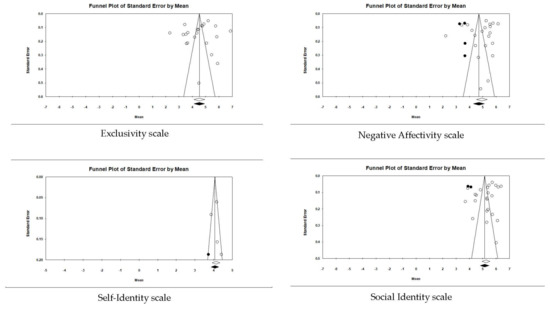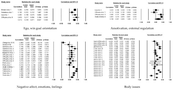Given the straightforwardness of our analyses, we entered the mean AIMS values and correlation coefficients. We interpreted the correlation values as follows: 0.10–0.29 as small, 0.30–0.49 as medium, and 0.50 or greater as large [19]. To assess the meaningfulness of mean level differences, we calculated Hedges’ g, and followed standard guidelines, with 0.20 as small, 0.50 as medium, 0.80 as large, and 1.30 as very large. We assumed heterogeneity, as heterogeneity exists in sport psychology meta-analyses [20]. Thus, we planned both random- and mixed-effects analyses. We reported the number of cases, sample size, r, 95% confidence intervals, heterogeneity, and publication bias statistics for our analyses. We reported the I2 statistic, the ratio of excess dispersion to total dispersion, as our heterogeneity measure with the following interpretation: <25 (low), at least 50 (medium), and >75 (high) [21]. For our moderator tests, we used a mixed-effects analysis. For these analyses, we reported the number of cases, sample size, r, 95% confidence intervals, and the Q total between (QTB) with an associated p-value. We set the statistical significance at the traditional p < 0.05. The QTB indicates the level of difference between different moderator levels. We conducted our meta-analyses using the Comprehensive Meta-Analysis (CMA) version 3 software (version 3.3.070, Biostat, Inc., Englewood, NJ, USA) and ran our descriptive analyses with Intellectus Statistics (https://www.intellectusstatistics.com/). Last, we examined our results (e.g., confidence intervals, sample sizes, and differences between groups and correlate categories) with the aim of assessing certainty.