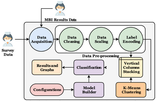 As discussed in the previous section, the authors collected data from the same nurse educators in two different datasets annotated by X1 and X2, where X1 consists of 33 columns while X2 consists of 3 columns. The current phase works on pre-processing the data by applying three cascaded stages. They are (1) data cleaning, (2) data scaling, and (3) label encoding. In the first stage, the data are cleaned by substituting the missing cells with zeros. The second stage performs standardization on the numeric columns using Equation (1), where X is the input image, Xoutput is the scaled image, µ is the image mean, σ is the image standard deviation.