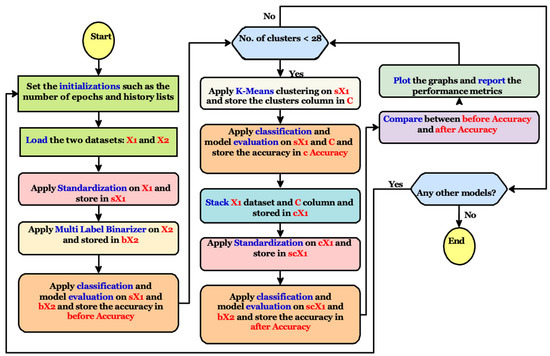 The classification process is applied two times: the first is performed before adding the clusters columns and the second is applied after adding it. To calculate the clustering accuracy, another classification process is utilized between the first dataset X1 and the clusters column reported from the k-means clustering algorithm. The flowchart presented in Figure 2 shows the phases and internal processes.