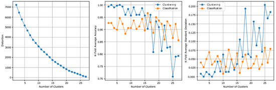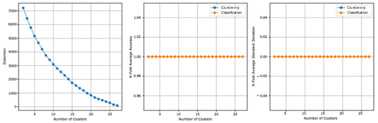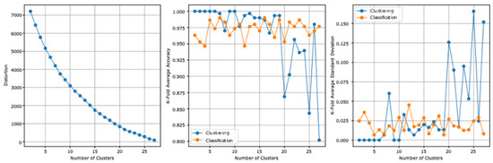 The two datasets report, before the stacking, an accuracy of 59.5% and a standard deviation of 0.126. Table 6 summarizes the first model experiment results after adding the clusters column. From the first experiment reported results, the highest clustering accuracy is 100% and reported at three and six clusters and the lowest standard deviation is 0 at the same clusters. The highest cross-validation classification accuracy is 96.66%, which is reported at 16 clusters, and the lowest standard deviation is 0.008, which is reported at 10 clusters. The lowest distortion is reported at 27 clusters, with a value of 89.013. Figure 3 presents the results graphically.