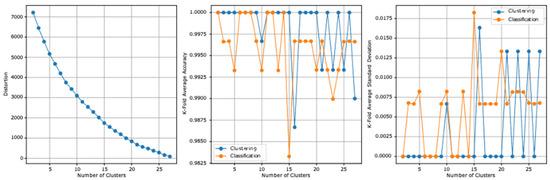 The two datasets report, before the stacking, an accuracy of 82.9% and a standard deviation of 0.047. Table 7 summarizes the second model experiment results after adding the clusters column. From the second experiment reported results, the highest clustering accuracy is 100% and the lowest standard deviation is 0. The highest cross-validation classification accuracy is 99.00%, which is reported at 16 clusters, and the lowest standard deviation is 0.007, which is reported at five clusters. The lowest distortion is reported at 27 clusters, with a value of 89.013. Figure 4 presents the results graphically.