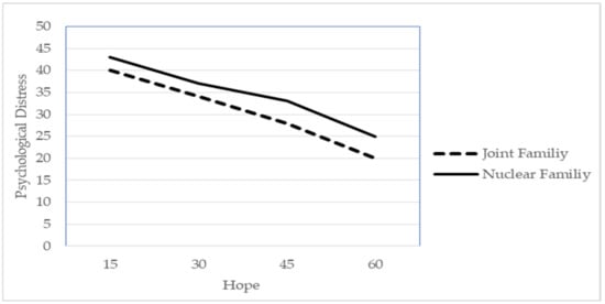 Figure 1 represents the graphical explanation of moderation; it shows that the relationship between hope and psychological distress is influenced by the moderation of the family system. It indicates that hope contributes to reducing the levels of psychological distress more for people living in joint families than for people living in nuclear families.
