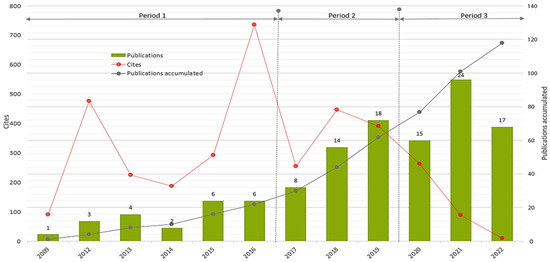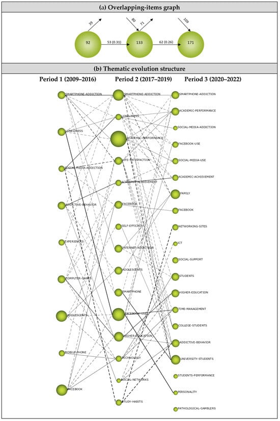 Another significant stage in bibliometric science mapping analysis is the period creation, which saves the data from uniformity [37], and allows for the longitudinal, comparative analysis of the conceptual/thematic evolution of the research field [65]. While determining the periods of analysis, Cobo et al. [65] suggest using two approaches: (1) focusing on key changes in the field and (2) ensuring the inclusion of a sufficient and balanced number of documents in each period. They also underline that including an almost balanced number of documents is compulsory to obtain rigorous results. In the current study, the periods were formed according to the number of publications as well as the empirical development of the field, such that Period 1 (2009–2016) comprised 22 articles, Period 2 (2017–2019) comprised 38 articles, whilst Period 3 (2020–2022) comprised 47 articles.