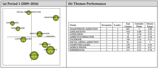 A total of nine main themes emerged during the first period (2009–2016). Smartphone-Addiction and Addictive-Behavior themes emerged as motor themes, contributing to the field’s development. Social-Media-Addiction, Mobile-Phone, and Experiences themes were the highly advanced and isolated themes. The themes in this region are strongly related but do not have the appropriate background or significance for the field. The Computer-Games theme was one of the emerging/declining themes, which was likely to have weakened during the relevant period. Adolescents, Loneliness, and Facebook themes were included in the basic and transversal themes, which needed to be developed more despite being related to the field. Nevertheless, five documents each represented Facebook and Adolescents themes of high significance.