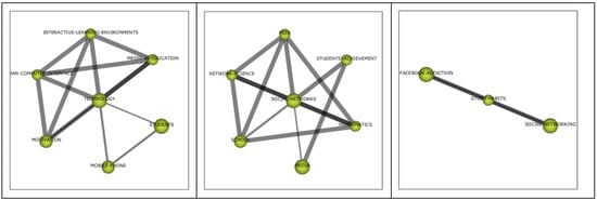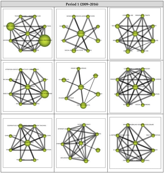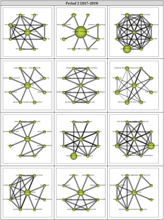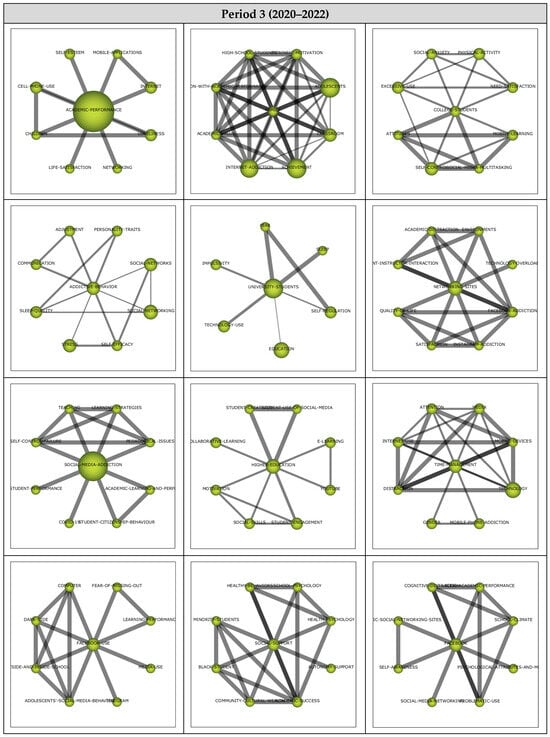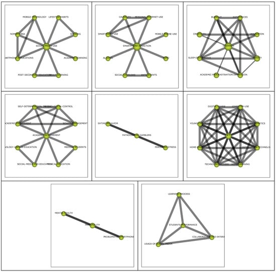 Cluster networks (Figure 5) were examined to determine the sub-themes related to the motor themes that emerged during the first period. Accordingly, the central theme of Smartphone-Addiction (1, 0.89) was strongly related to Smartphone-Use, Perceived-Stress, Academic-Performance, Depression, Stress, University-Students, Internet-Addiction, and Technology-Use, with strong interrelationships among all sub-themes. Studies on Smartphone-Use [51], Perceived-Stress [75], Academic-Performance [33], Depression [76], Stress [75], University-Students [77], Internet-Addiction [78], and Technology-Use [79] illustrate the sub-themes in the Smartphone-Addiction cluster network.
