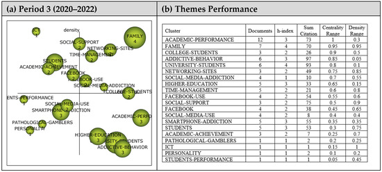 A total of 15 themes emerged from analyzing the 38 articles in the second period as shown in the strategic diagram in Figure 6. The performance values (i.e., h-index, centrality, and density values as well as the number of documents and sum citations for each theme) are also presented.